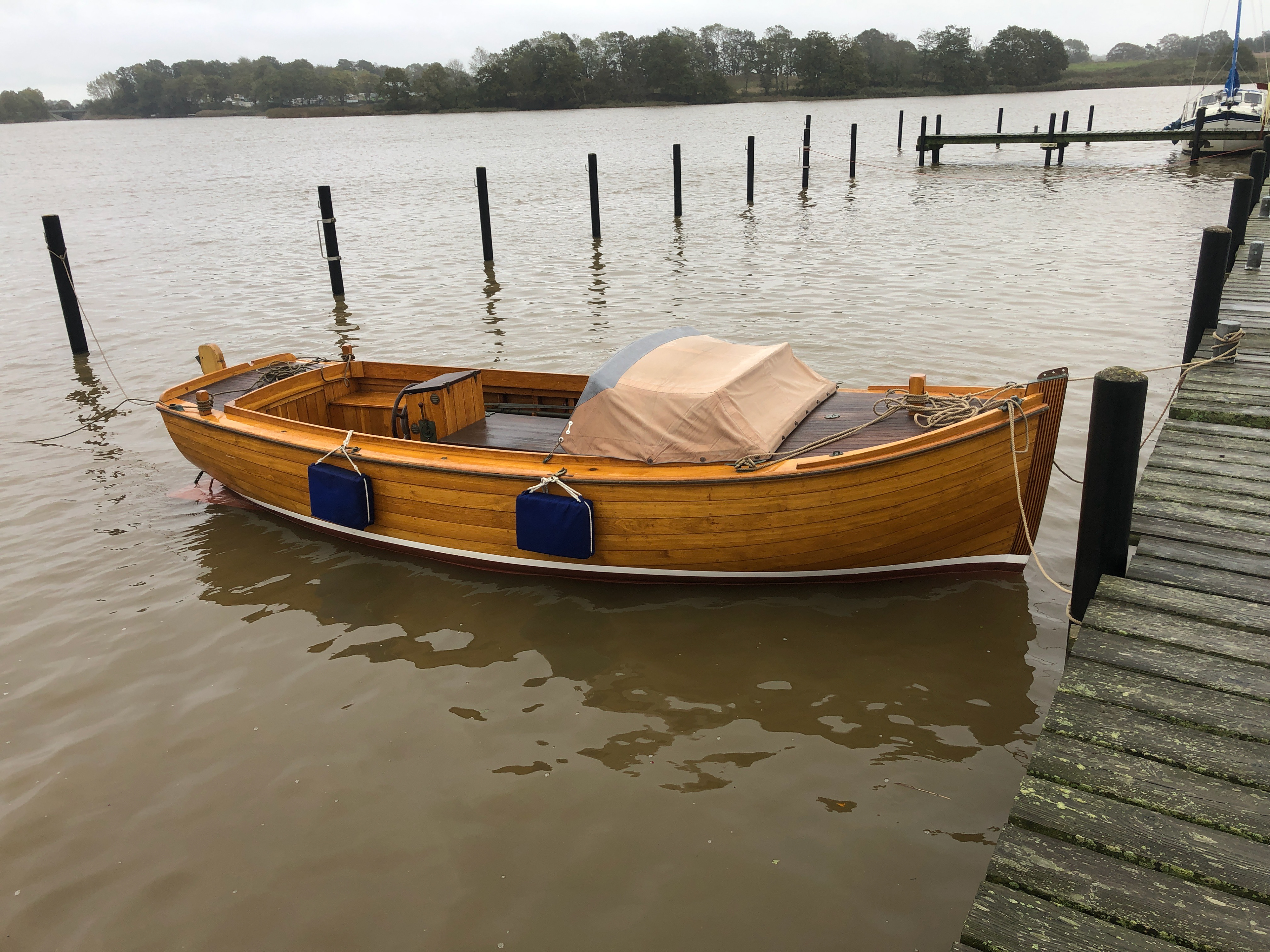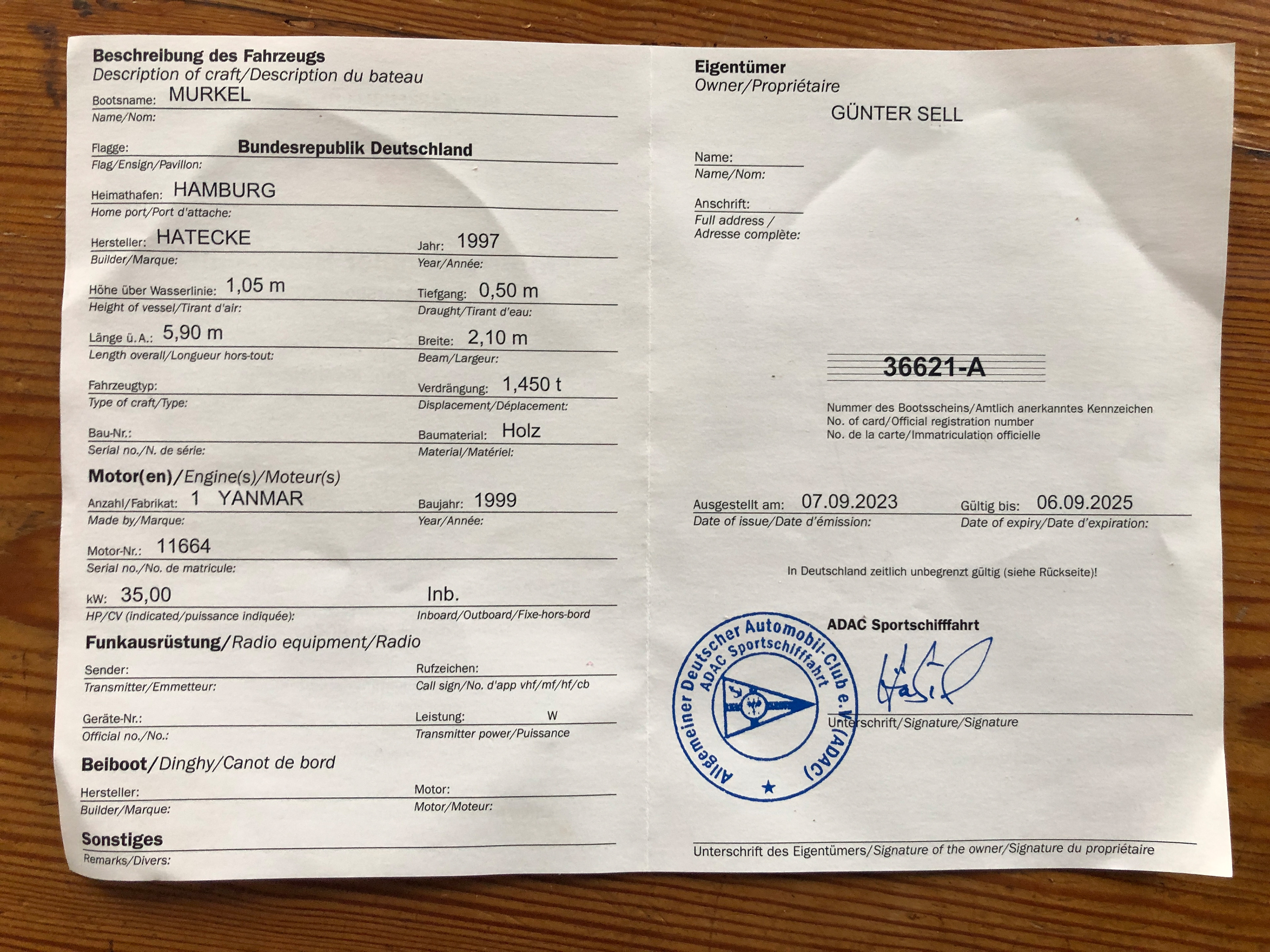Länge 5,90m, Breite 2,10m, Tiefgang 0,5m, Verdrängung 1,450t